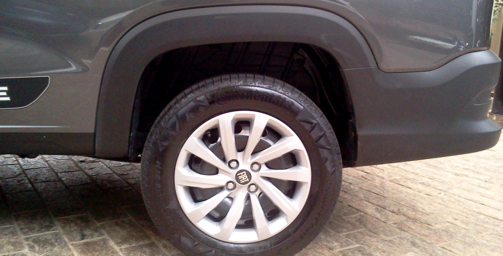 Finalizando nossa observação externa, destaque ainda para as rodas, que são em chapa na cor chumbo de 15' (nas unidades testadas por nós com calotas) e onde são instalados pneus de medida 195/65 R15, além da merecida referência para o bom acabamento e proteção da caçamba.